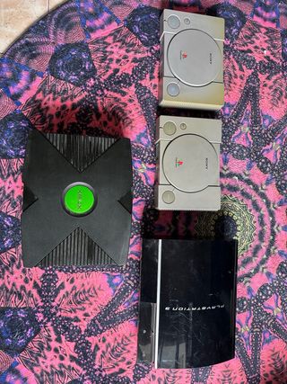 Lote de consolas de videojuegos, algunas para piezas. - Incluye consolas de Xbox, PlayStation 1 y PlayStation 3. - La Xbox presenta un error 5. Ps1 en perfecto estado ps1 le cuesta leer los juegos ps3 para piezas