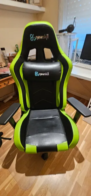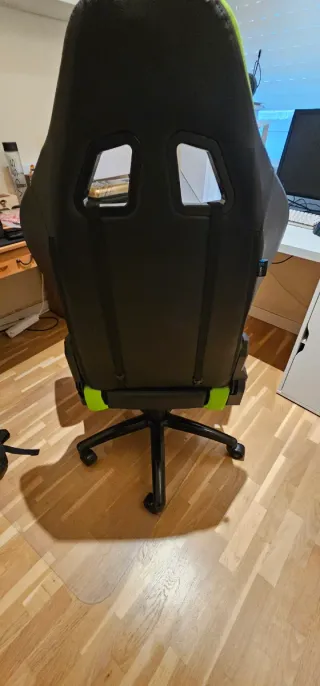 Silla de estilo gamer con un diseño moderno en negro y detalles en verde. - Respaldo alto con soporte para cabeza. - Asiento acolchado. - Reposabrazos. - Base con ruedas para fácil movilidad.