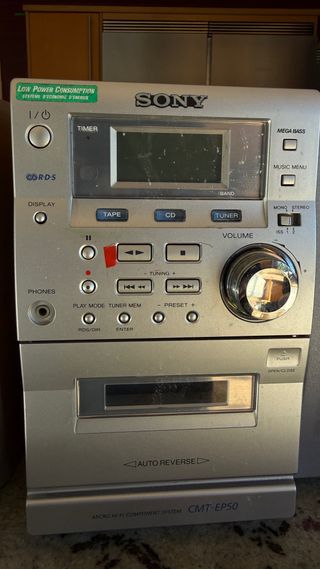 Minicadena de música SONY CMT-EP50 con dos altavoces. - Diseño compacto y elegante. - Funciones de radio y CD. - Reproductor de cassette con auto reverse.