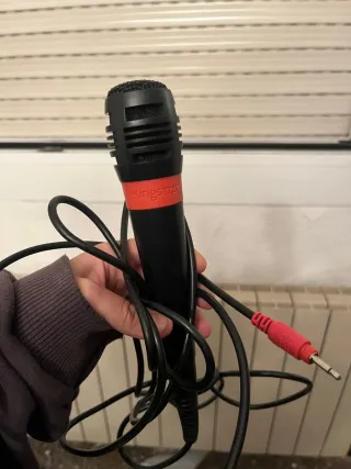 Micrófono para juegos de karaoke con cable. - Diseño en color negro con detalles en rojo. - Conector de audio estándar.
