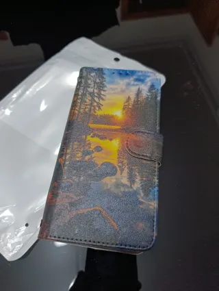 Funda para móvil con un bonito diseño de paisaje al atardecer. Incluye tarjetero. - Diseño de paisaje con árboles y lago. - Cierre con solapa y cuerda para llevarlo bien - Compartimentos para tarjetas.