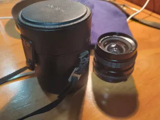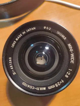 Objectiu Sigma Mini-Wide 28mm f/2.8, fabricat al Japó. En bon estat general, amb marques d’ús normals però òptica neta i sense ratllades importants (veure fotos). Inclou estoig rígid original i tapa frontal. Ideal per fotografia analògica o col·leccionistes, molt compacte i lluminós.