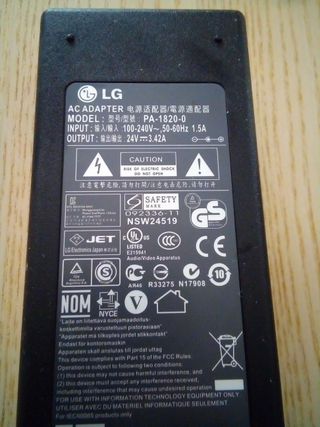Adaptador de corriente LG. - Modelo: PA-1820-0 - Entrada: 100-240V~, 50-60Hz 1.5A - Salida: 24V 3.42A