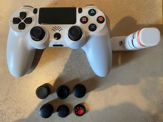 Mando de PlayStation 4 en color blanco. Incluye varios accesorios para mejorar la experiencia de juego. - Mando inalámbrico. - joysticks. - Adaptador Remoto para cargar el mando.