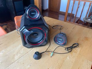 Sistema de altavoces Philips con conexión Minijack. - Altavoz principal con diseño octogonal. - Dos altavoces satélite. - Acabado en negro con detalles en rojo.