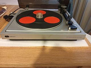 Tocadiscos Strathearn STM-4 con tracción directa electrónica. - Diseño elegante en color plata y negro. - Plato con detalles en rojo.