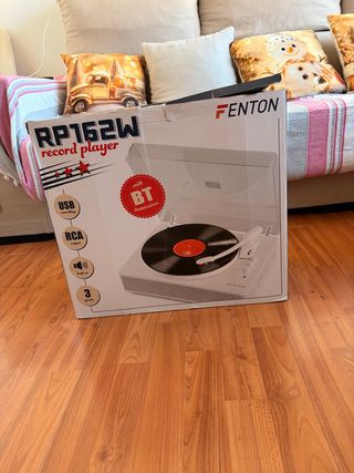 Tocadiscos Fenton RP162W en color blanco. Ideal para disfrutar de tu música. - Conexión USB para grabación. - Transmisor Bluetooth integrado. - Salida RCA. - Entrada auxiliar. - Tres velocidades de reproducción.
