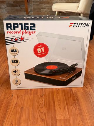 Tocadiscos Fenton RP162 con acabado en madera. - Conexión USB para grabación. - Transmisor Bluetooth integrado. - Salida RCA. - Altavoces incorporados. - Tres velocidades de reproducción.