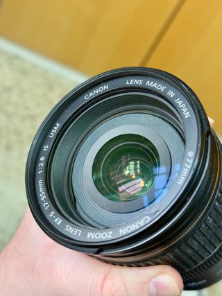Objetivo Canon EF-S 17-55mm f/2.8 IS USM Objetivo de alta calidad y muy luminoso con apertura constante f/2.8, ideal para retratos, eventos, fotografía en interiores y uso general. Ofrece excelente nitidez, estabilizador de imagen (IS) y enfoque rápido y silencioso gracias al motor USM. Lo he utilizado con una Canon EOS 750D y funciona perfectamente. Lentes en muy buen estado, sin hongos ni rayaduras. Muy cuidado y listo para usar. Incluye filtro UV de protección.
