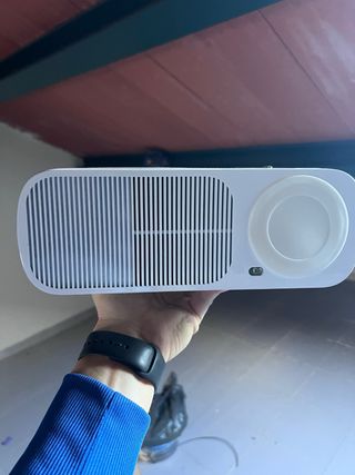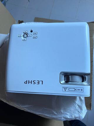 Proyector de color blanco. - Diseño compacto y moderno. - Panel de control superior con botones. - Lente frontal con ajuste. - Indicador de advertencia en la parte inferior. Este proyector me costó 240€