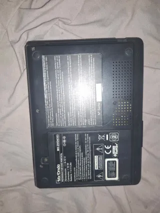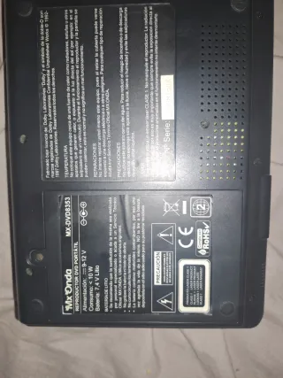 Reproductor de DVD portátil de la marca MX Onda. - Modelo: MX-DVD8353 - Alimentación: 9-12 V - Consumo: < 10 W - Batería: 7,4 V Litio