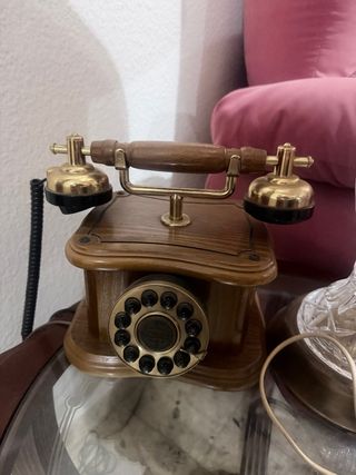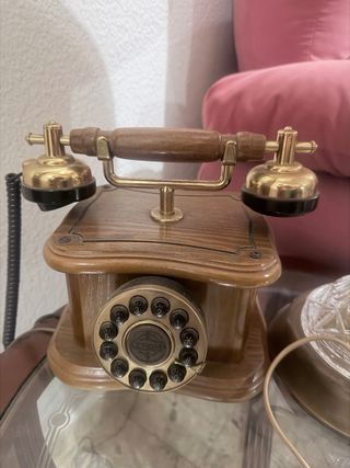 Este teléfono de época añade un toque clásico a cualquier espacio. Su diseño combina materiales de calidad para un estilo único. - Base de madera con detalles. - Auricular y base de latón brillante. - Marcación rotatoria. - Cable en espiral. -marca thomas
