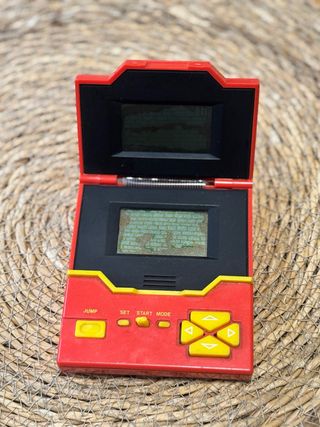 Consola portátil clásica Hero Princess en llamativos colores rojo y amarillo. Un diseño retro para horas de diversión. - Pantalla LCD. - Botones de control de juego. - Diseño plegable. funcionando le falta la tapadera de las pilas