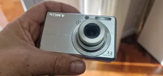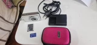 Cámara digital Sony Cyber-shot plateada, ideal para capturar tus momentos. - Incluye batería. - Tarjeta de memoria SanDisk 4GB. - Cargador de batería. - Funda para cámara.