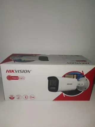 Cámara de vigilancia Hikvision con tecnología Smart Hybrid Light. - Resolución HD. - Certificación IP67 para resistencia al agua y polvo. - Micrófono integrado. - Diseño compacto y moderno.
