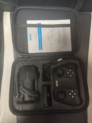 Dron de la marca 4DRC en color negro, ideal para capturar imágenes aéreas. - Incluye funda de transporte. - Diseño compacto y portátil.