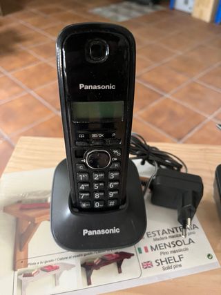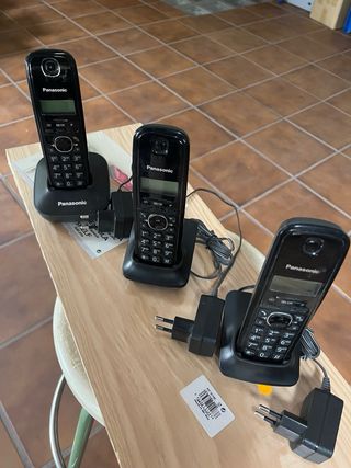 Conjunto de tres teléfonos inalámbricos Panasonic, - Tres bases de carga incluidas. - Adaptadores de corriente. - hay que poner pilas