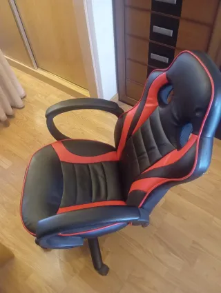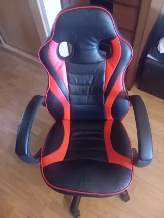 Silla ergonómica de estilo gamer, diseñada para largas sesiones. - Tapicería en cuero sintético negro y detalles en rojo. - Respaldo con diseño deportivo y orificios. - Reposabrazos curvos.