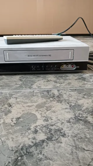 Reproductor combinado de DVD y VCR con sonido Hi-Fi Stereo. - Frontal plateado. - Conexiones de audio y video. - Incluye mando a distancia.