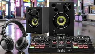 Equipo completo para DJ. - Mesa de mezclas DJ Hercules. - Dos altavoces DJMonitor 32. - Auriculares DJ. - Color negro y multicolor.