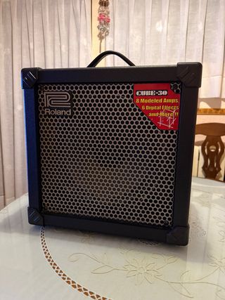 Vendo amplificador Roland Cube 30 ideal tanto para practicar en casa como para pequeños directos o ensayos. Compacto, robusto y con muchas posibilidades de sonido.  Lo que ofrece: • 30 W de potencia con altavoz de 10″ que proporciona un sonido definido y con cuerpo.  • 2 canales (Clean y Lead) para pasar de tonos limpios a saturados fácilmente.  • 8 modelos de amplificador COSM (incluye sonidos tipo Fender, Vox, Marshall y más) para adaptarse a varios estilos.  • EFX integrados: chorus, flanger, phaser y tremolo para enriquecer tu tono sin pedales extra.  • Delay y reverb independientes para texturas más ricas.