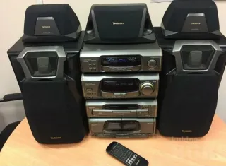 Equipo de sonido Technics con dos altavoces y unidad central. - Altavoces de color negro. - Unidad central plateada y negra. - Incluye auriculares.