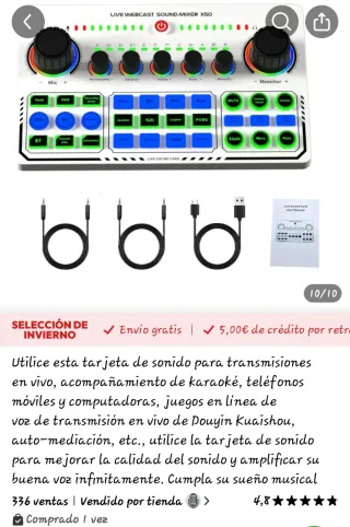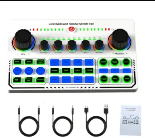 Cambiador de hoz con efectos.Tarjeta de sonido XSO para transmisiones en vivo y karaoke. - Ideal para teléfonos móviles y computadoras. - Mejora la calidad del sonido para streaming. - Incluye cables y manual de usuario.