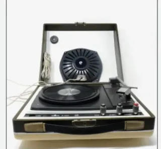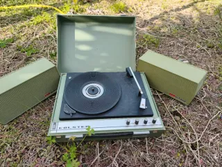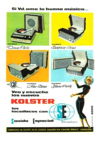 Tocadiscos portátil vintage Kolster Rainbow Party. Incluye dos altavoces. Año 1960 - Diseño retro. - Color verde. Tipo: Tocadiscos estereofónico transportable en formato maleta con altavoces laterales incorporados. Velocidades de reproducción: 16, 33 y 45 rpm. Válvulas: Incluye válvulas ECC83 (2), EL84 (4) y EZ80 (2). Alimentación: 120/150/220 V ac. Controles: Selector de velocidad, mandos giratorios frontales para volumen, agudos, graves, balance y selector de entrada. Fabricación: Fabricado en España por Kolster Ibérica