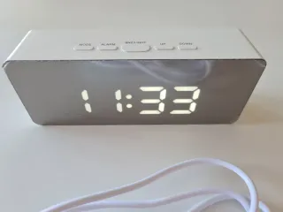Reloj despertador digital con acabado espejo. - Diseño moderno y elegante. - Botones de control en la parte superior. Tiene alarma Marca la temperatura La pantalla tiene 2 intensidades de luz Incluyo pilas Se puede poner por cable también Conserva la pegatina de protección de la pantalla.