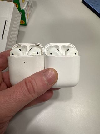 Auriculares inalámbricos Apple AirPods de segunda generación. En perfecto estado de conservación, batería con mas de 2h de funcionamiento en auriculares y mas de 4 cargas completas en estuche. Incluye; - Auriculares Apple AirPods 2.a generación. - Estuche de carga. - Caja y documentación original. - Gomas intraurales de silicona para deporte. - Cordeles de silicona anti caída para los auriculares. - Estuche de protección de polipiel. Diseño ergonómico para mayor comodidad. Conexión rápida y estable sobretodo con otros dispositivos Apple. Un saludo.