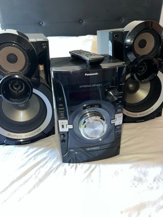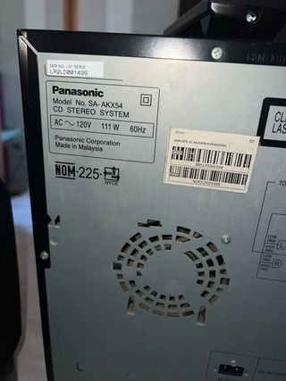 Equipo de música estéreo CD de la marca Panasonic. - Modelo: SA-AKX54 - Voltaje: 120V - Potencia: 111W - Frecuencia: 60Hz - Fabricado en Malasia