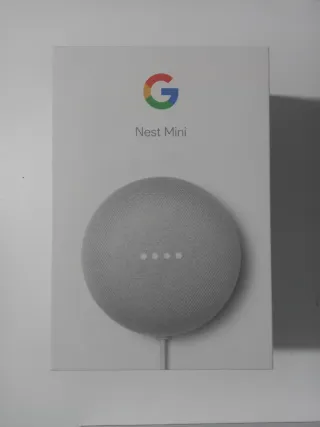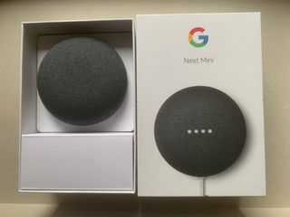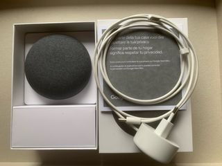 Altavoz inteligente Google Nest Mini en color gris. Compacto y con un diseño moderno. - Asistente de voz integrado. - Sonido de alta calidad. Cargador Caja e instrucciones originales