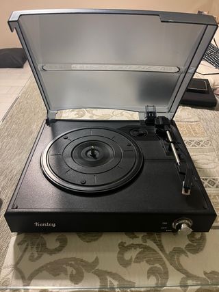Tocadiscos Kenley en color negro, con muy poco uso. - Diseño elegante y compacto. - Tapa protectora transparente. - Con salida Jack y RCA - Altavoces incorporados Vendo por adquisición de uno superior.