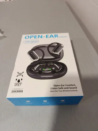 Cascos inalámbricos con diseño Open Ear. - Modelo YYK-Q165. - Resistencia al agua IPX7. - Autonomía de 10H/80H. - Comodidad Open-Ear para escuchar de forma segura.