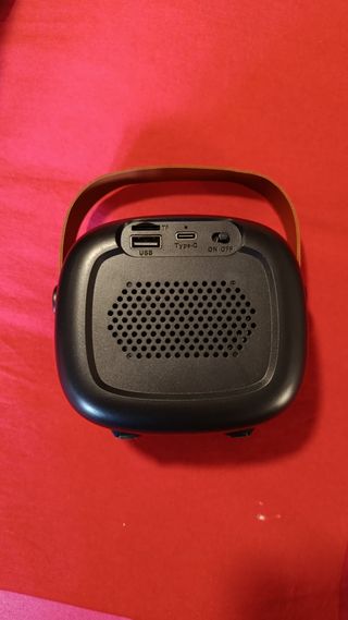 Altavoz portátil con función karaoke y luces LED. - Conexión USB. - Ranura para tarjeta TF. - Puerto de carga Tipo-C. - Interruptor ON/OFF.