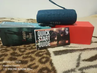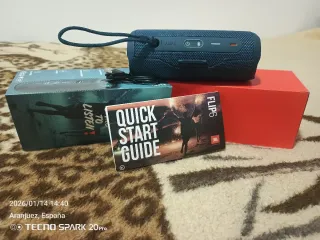 Altavoz portátil JBL Flip 6 en color azul marino y rojo. Incluye guía de inicio rápido. - Diseño compacto y resistente. - Correa para transporte. - Cable de carga USB-C.