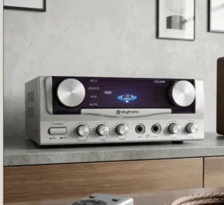 Amplificador Skytronic 103.102 con múltiples funciones. 50w x 2 8oms Suena muy bien - Entradas para micrófono (MIC1, MIC2). - Controles de volumen para micrófono. - Control de eco. - Entradas AC-3, CD/VCD, AUX. - Botón de Mute. - Control de volumen principal.