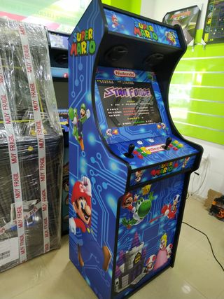 La arcade está personalizada a la espera de que te la lleves a casa. ARCADE GOLD: Puedes conocerla en profundidad en nuestra tienda. Mide 1,73m de alto, 63cm de ancho y 60cm de fondo. Pantalla panorámica de 24”. Vinilos plastificados a prueba de rallados. Sistema de sonido 2.1. Sistema operativo Recalbox con 8.000 juegos. Botonera 12 botones jugables + 2 de servicio + 2 players. Tarjeta de 16gb.
