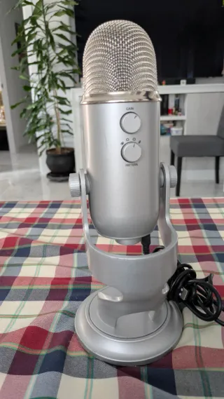 Micrófono de condensador Blue Yeti Logitech en color plateado. Ideal para grabaciones y streaming. Buen estado, ligeras marcas de uso. Entrego un filtro antipop y su cable usb. - Diseño elegante y moderno. - Controles de ganancia y patrón de captación.