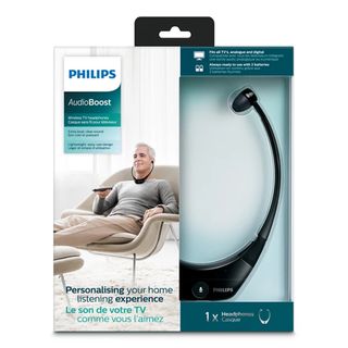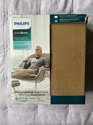Auriculares inalámbricos Philips AudioBoost para TV. Diseñados para una experiencia de sonido clara y potente. - Compatibles con televisores analógicos y digitales. - Diseño ligero y fácil de usar. - Sonido extra fuerte y claro. - Listos para usar con 2 baterías incluidas.
