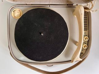 Tocadiscos portátil de la epoca. Lleva almacenada décadas, suciedad acumulada e incrustada. No enciende. La goma que cubre el plato de metal no lo tiene, la felpa negra no es suya. Para coleccionista o decoración vintage.