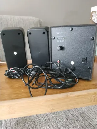 Conjunto de altavoces de la marca Trust. - Diseño en color negro y plateado. - Incluye dos altavoces satélite y un subwoofer. Funciona perfectamente. Lo vendo porque me mudo!!