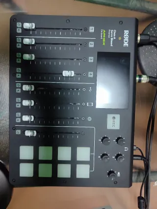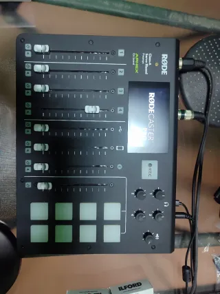 Consola de mezcla Rodecaster Pro para podcasts. Diseñada para una calidad de audio profesional. - Múltiples faders para control de sonido. - Pantalla táctil integrada. - Botones programables para efectos de sonido.
