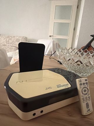 Lector de discos JVC con un diseño moderno y elegante. - Color beige y negro. - Incluye mando a distancia. Y altavoz