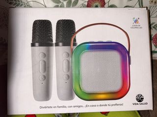 Kit de karaoke para divertirse en familia o con amigos. Incluye dos micrófonos y un altavoz con luces LED. - Dos micrófonos inalámbricos. - Altavoz con diseño moderno y luces de colores LED. - Ideal para usar en casa o donde prefieras.