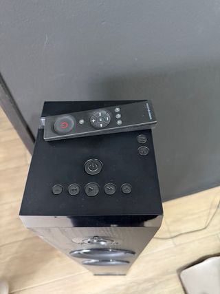 Torre de sonido con un diseño elegante y moderno. - Altavoz principal de gran tamaño. - Dos altavoces secundarios. - Base estable para su colocación.