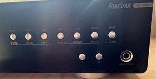 Amplificador Fonestar AS-150R en color negro. - Botones de función: Tuner, DVD, CD, AUX, VCR, Menu, Mute. - Botones secundarios: Exit, AM/FM, Scan-, Scan+, Memory, A/B/C/D, 1-8. - Conexión para auriculares.
