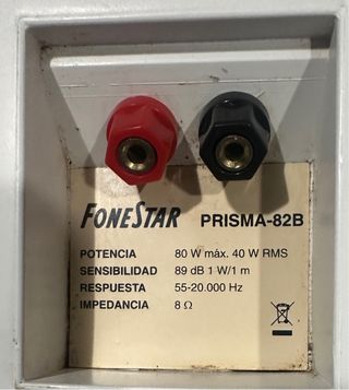 Altavoces Fonestar modelo Prisma-82B. - Potencia: 80 W máx. / 40 W RMS. - Sensibilidad: 89 dB 1 W/1 m. - Respuesta de frecuencia: 55-20.000 Hz. - Impedancia: 8 Ω.