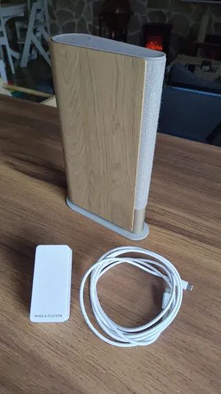 Altavoz de diseño Bang & Olufsen Beosound Emerge. Cómo nuevo, con cargador y cable originales. - Acabado en madera clara y tela beige. - Bluetooth y Chromecast - Controles táctiles en la parte superior.