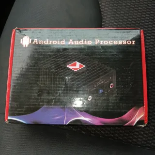 Procesador de audio para coche con conexión Android. - Diseño moderno con detalles en rojo y negro. - Indicadores de volumen y conexión.